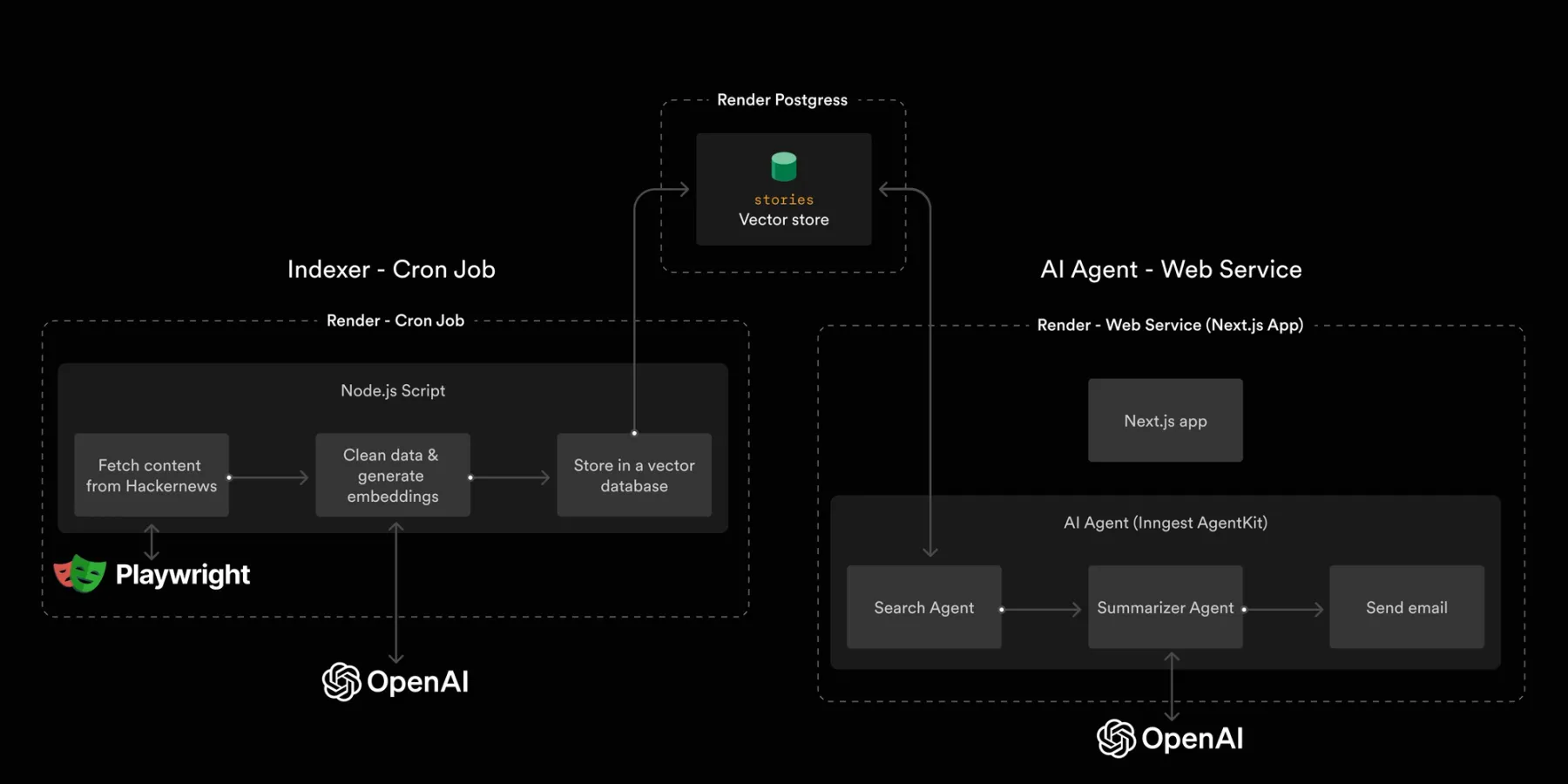 - Indexer cron job: Periodically fetches new Hacker News stories based on topics you're interested in, generates embeddings of the content, and stores the data in the database.